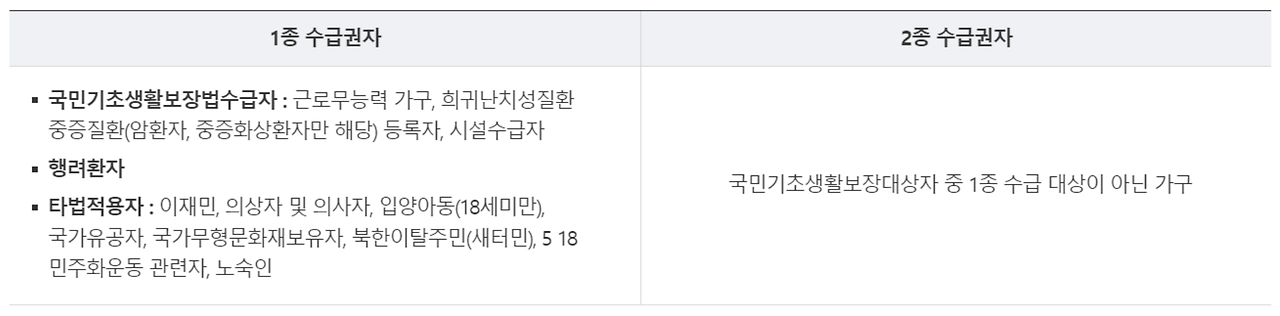1. 기초생활수급자 기초생활수급자는 소득 인정액이 최저생계비 이하인 사람들로, 생계급여와 함께 의료급여를 받을 수 있습니다. 주요 대상은 고령자, 장애인, 한부모 가정 등이 포함됩니다.